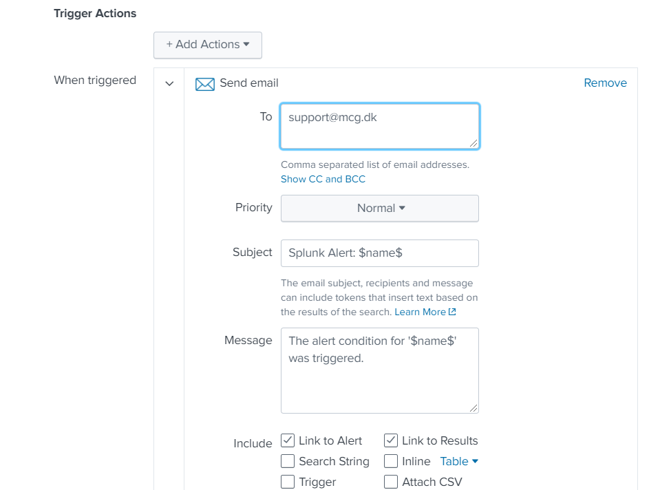 Trigger condition is when results are found, it can send email each time the search runs and there are found results or Throttle it so it only send each X hour.