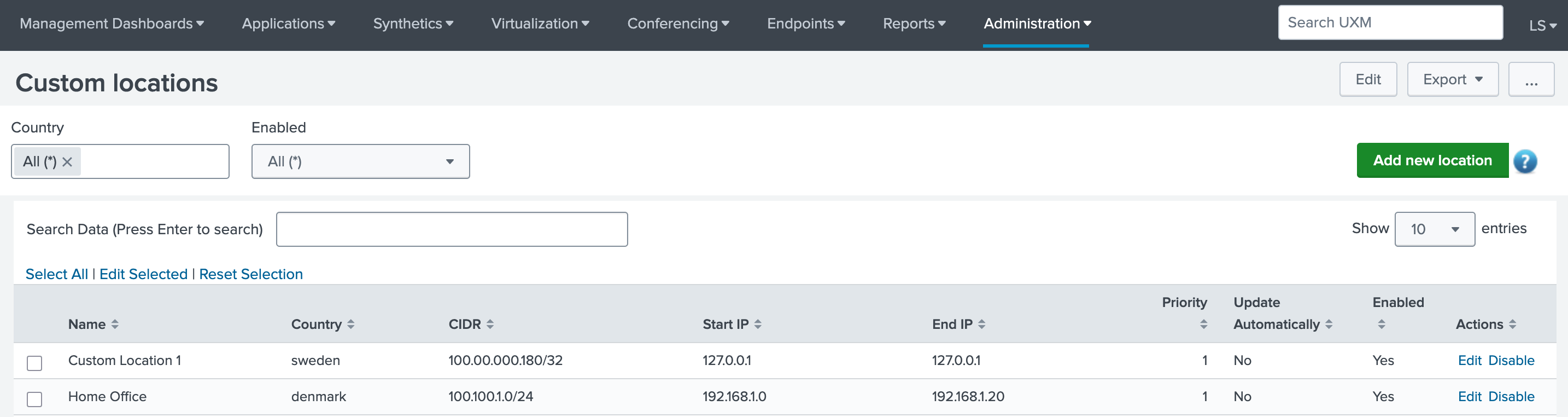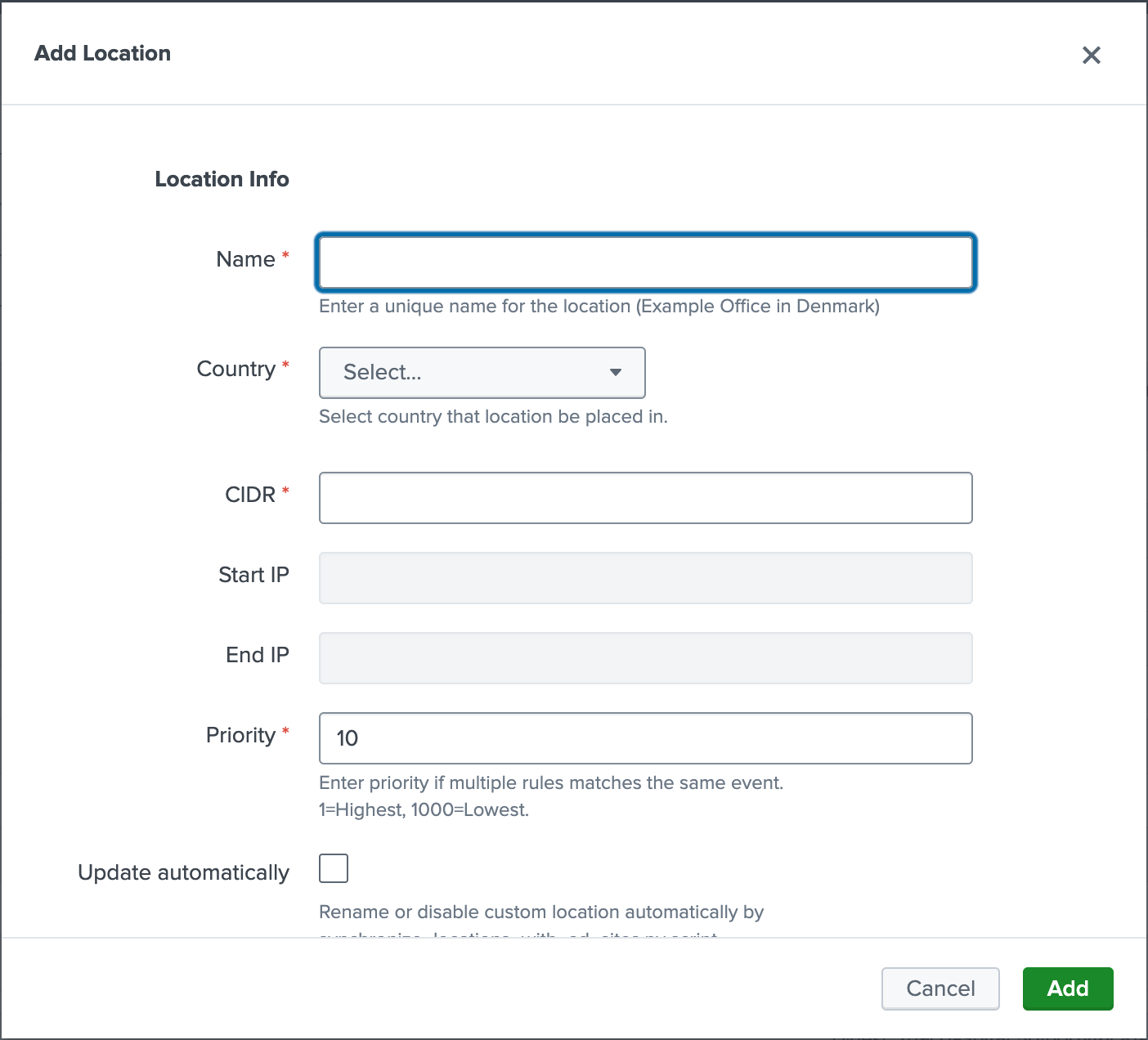 Define custom locations using country, CIDR and a range of internal IP's.