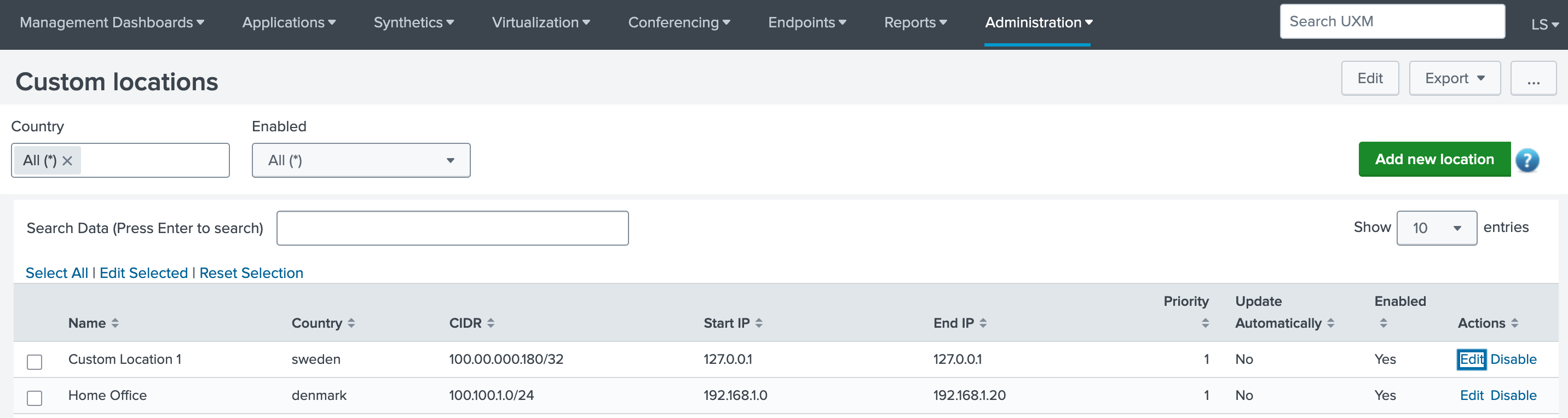 To modify a custom location, click the "Edit" option under the "Actions" column, at the corresponding location row you wish to edit.