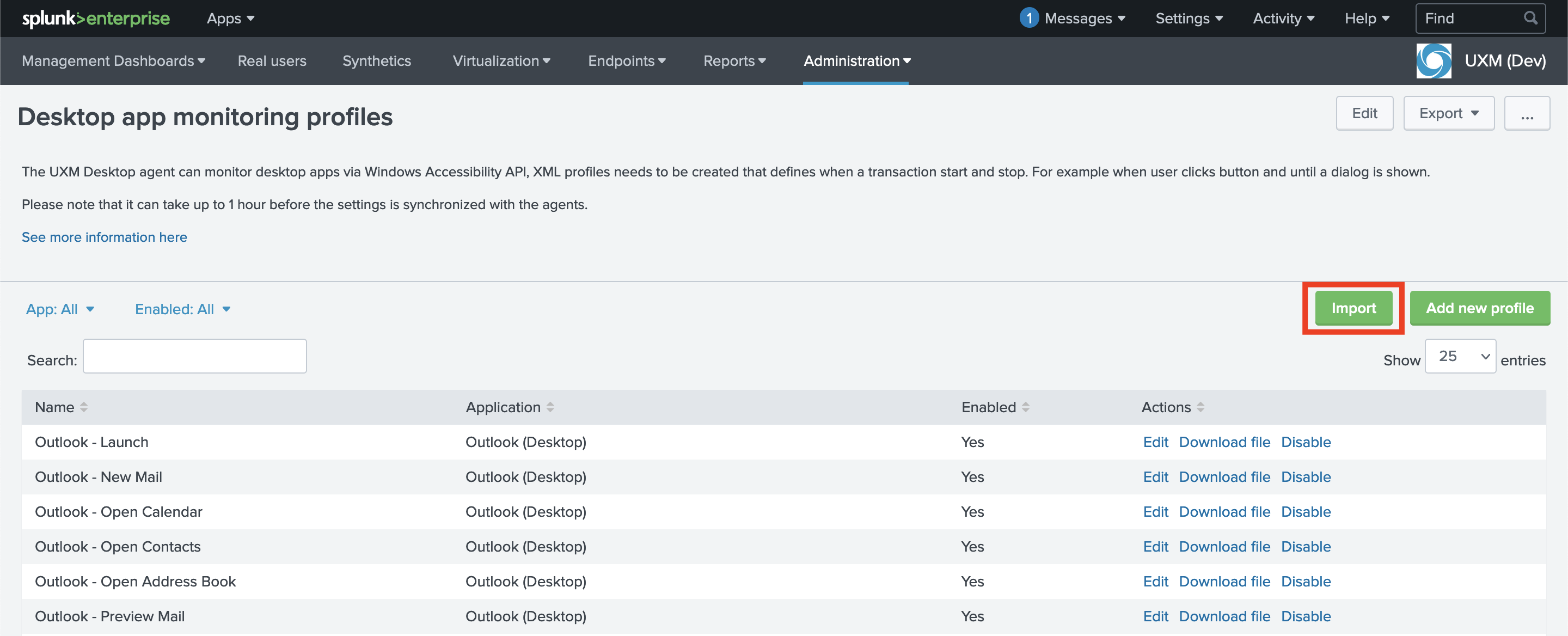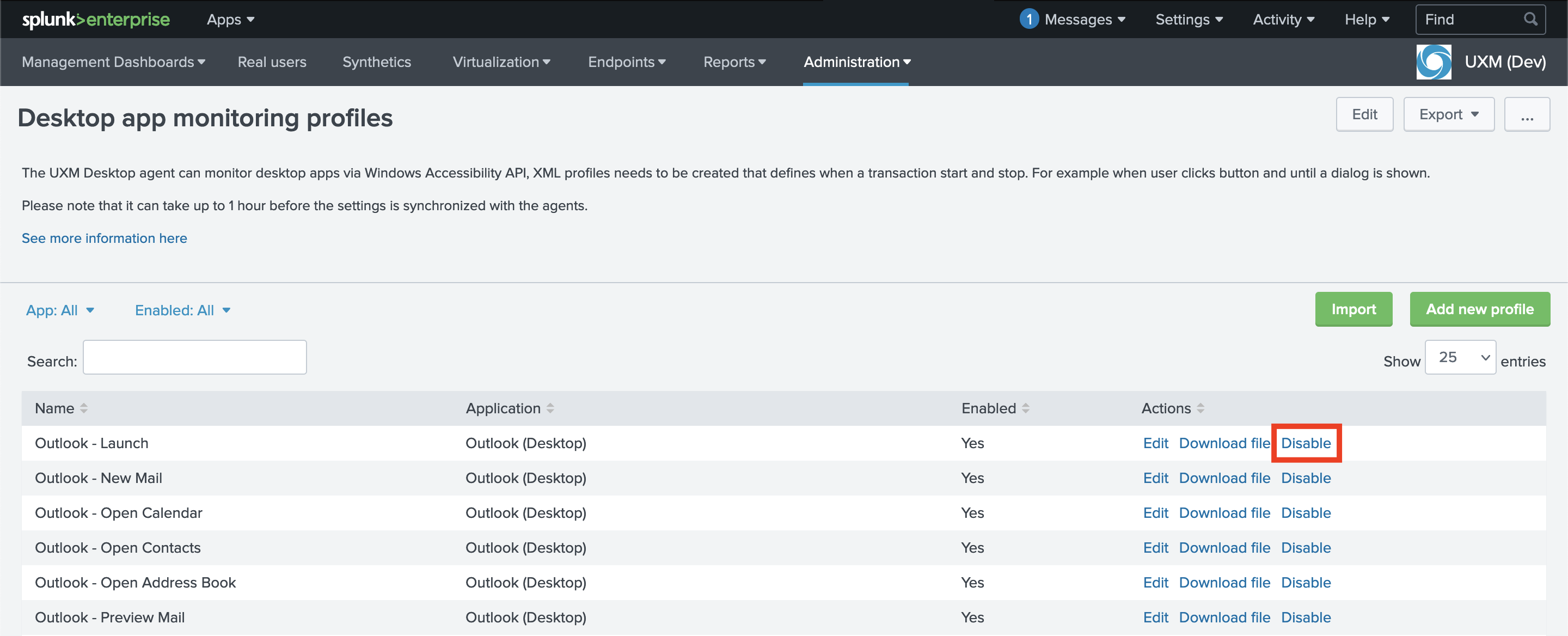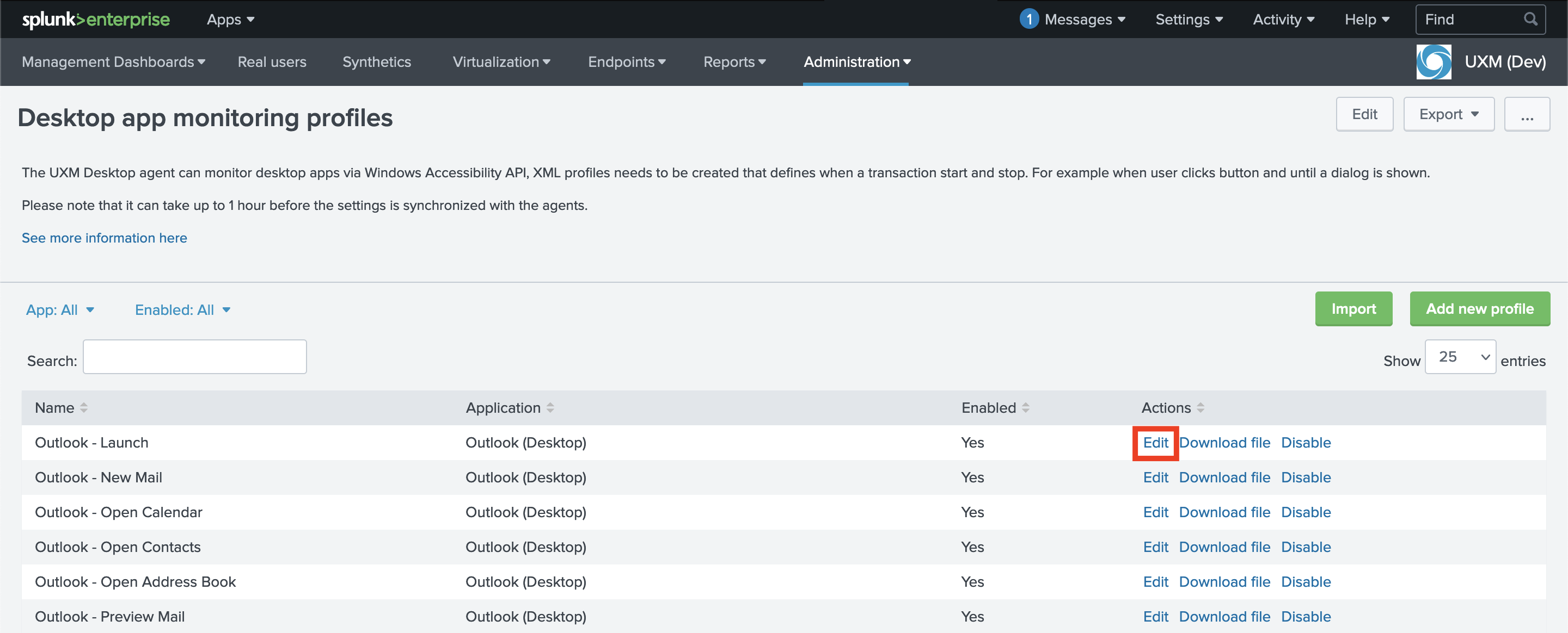 Using the dropdown menu, navigate to Administration -> UXM Desktop Agent -> Desktop App Monitoring Profiles.
