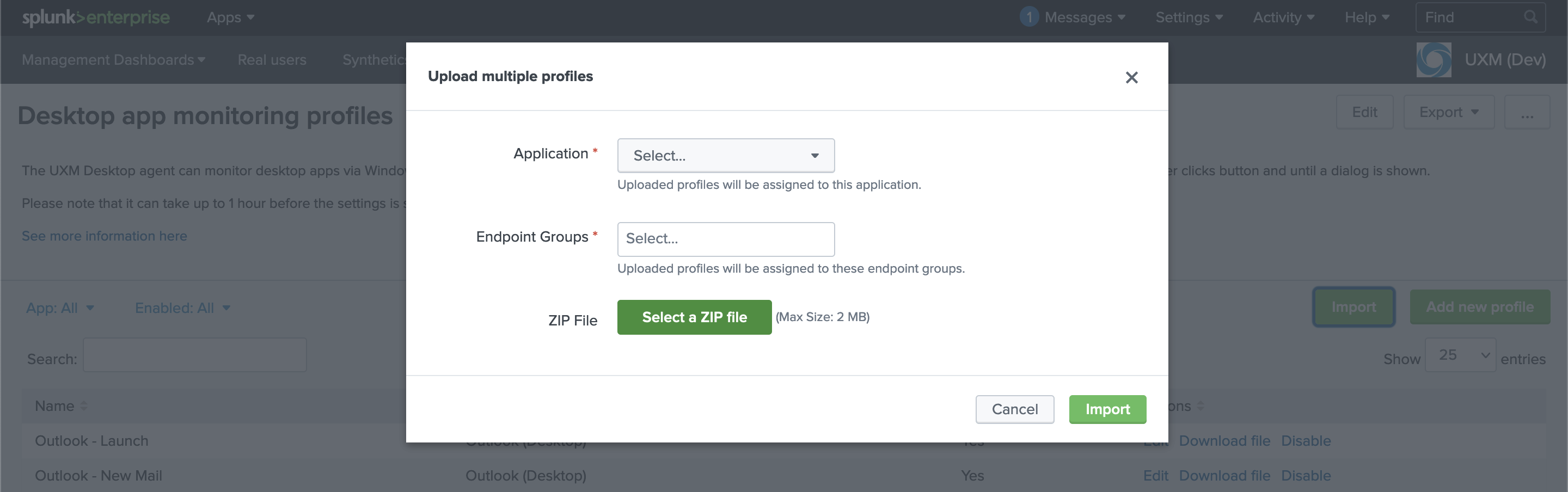 After clicking Import, a pop-up window will be shown. Complete the fields, upload the ZIP folder and import the profiles.