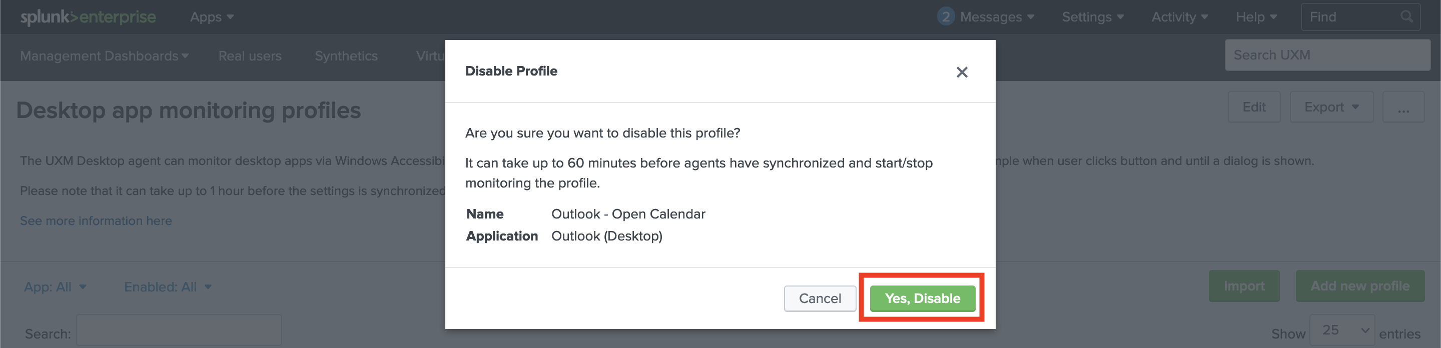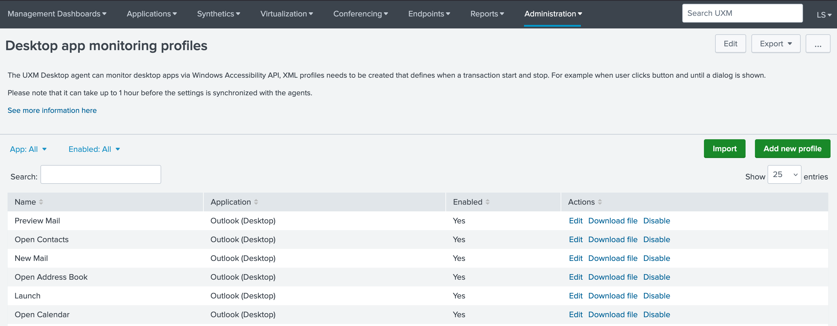 Please note that it can take up to 1 hour before the settings are synchronized with the agents after creating, editing, deleting, and importing profiles.