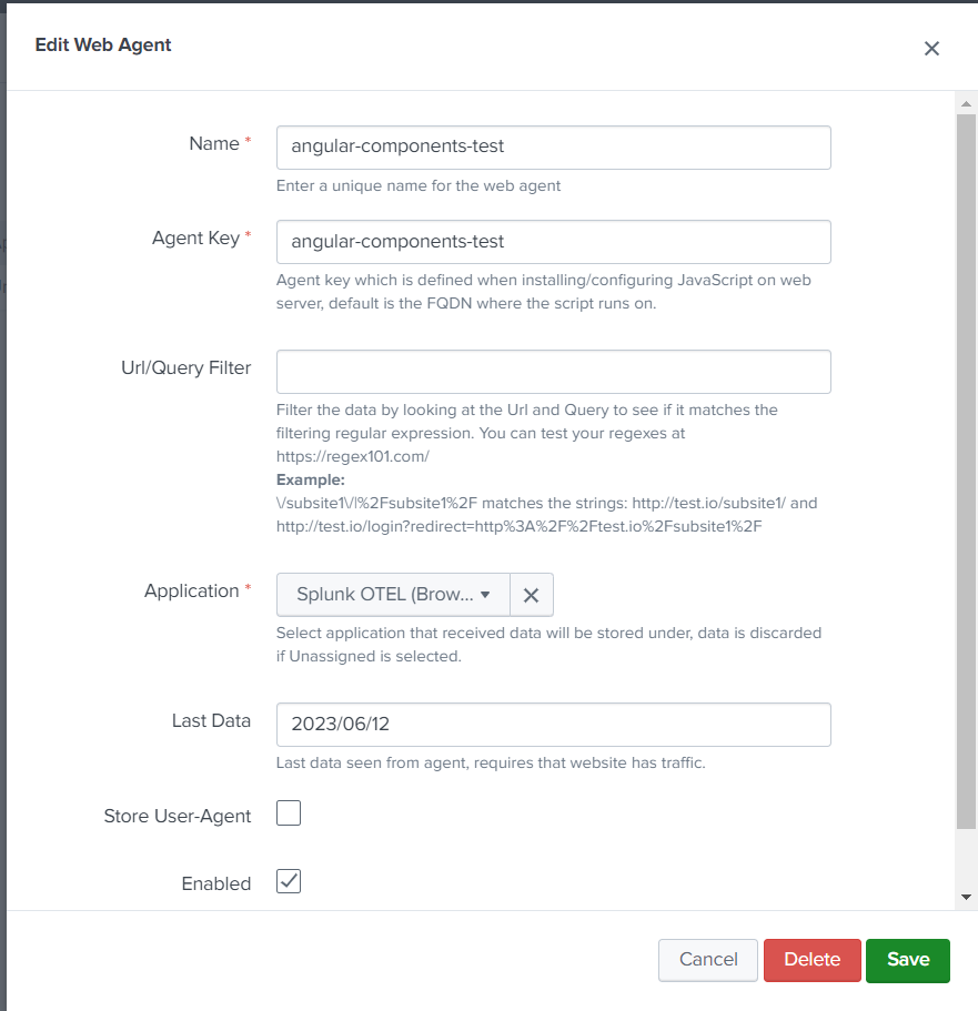 Edit the correct agent and set the application to store data under and enabled to true.