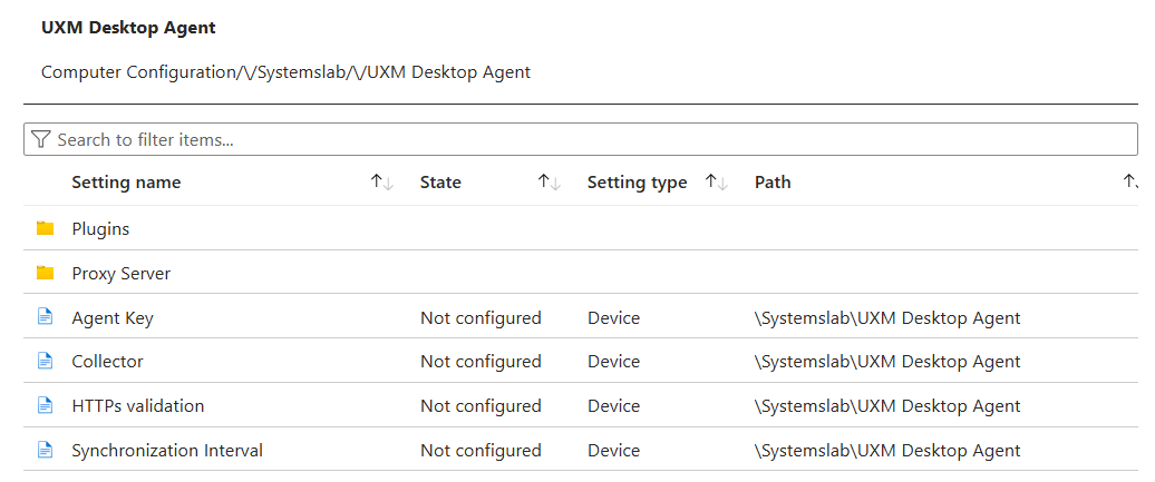 Expand Systemslab -> UXM Desktop Agent under Computer Configuration, if the policy isn't available it can help to skip this step, create the profile and edit it again afterwards, then the policies will appear.