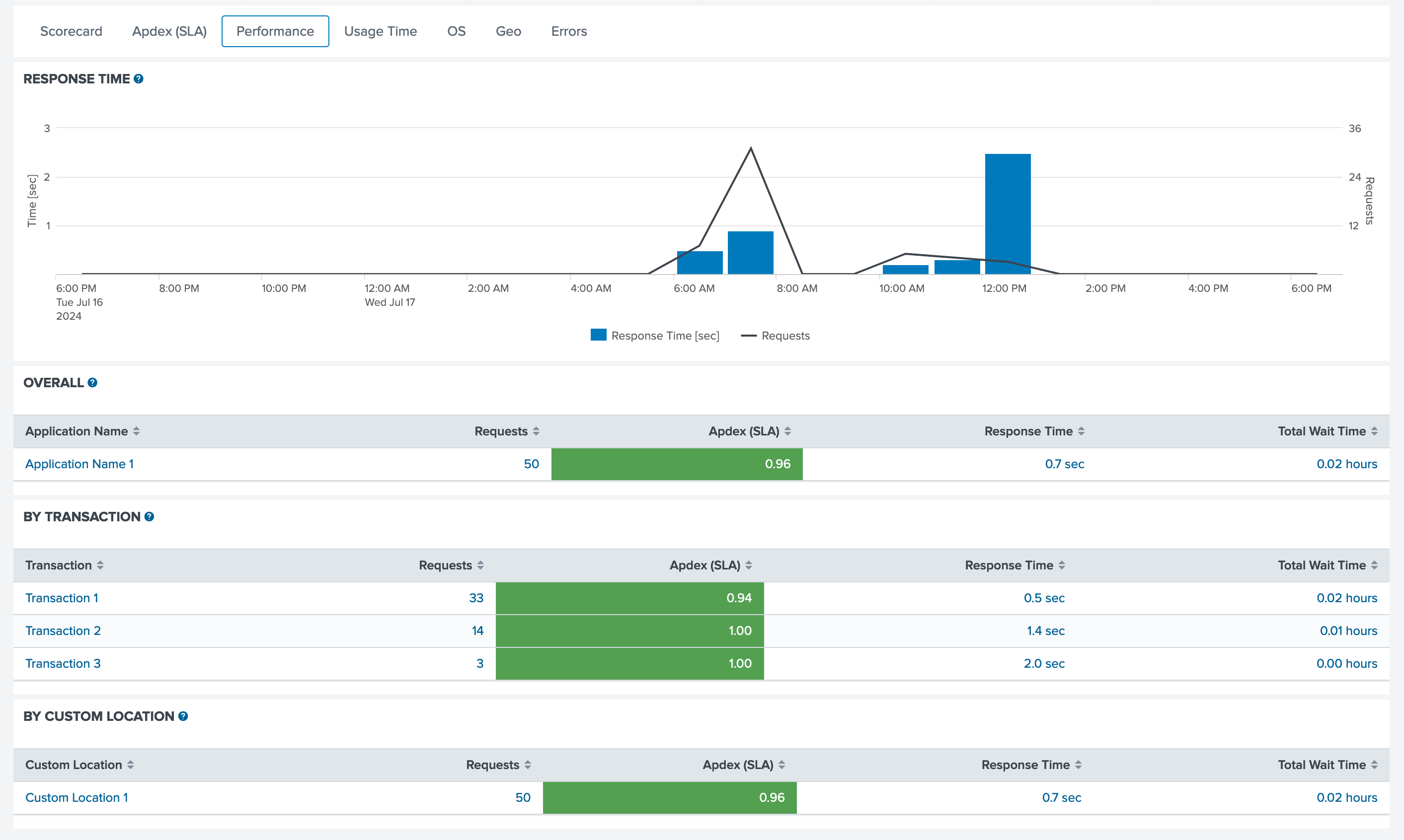 Web and desktop application's performance analysis with the overall data, transactions and custom locations. While navigating in this tab, click any table's row to access more details.