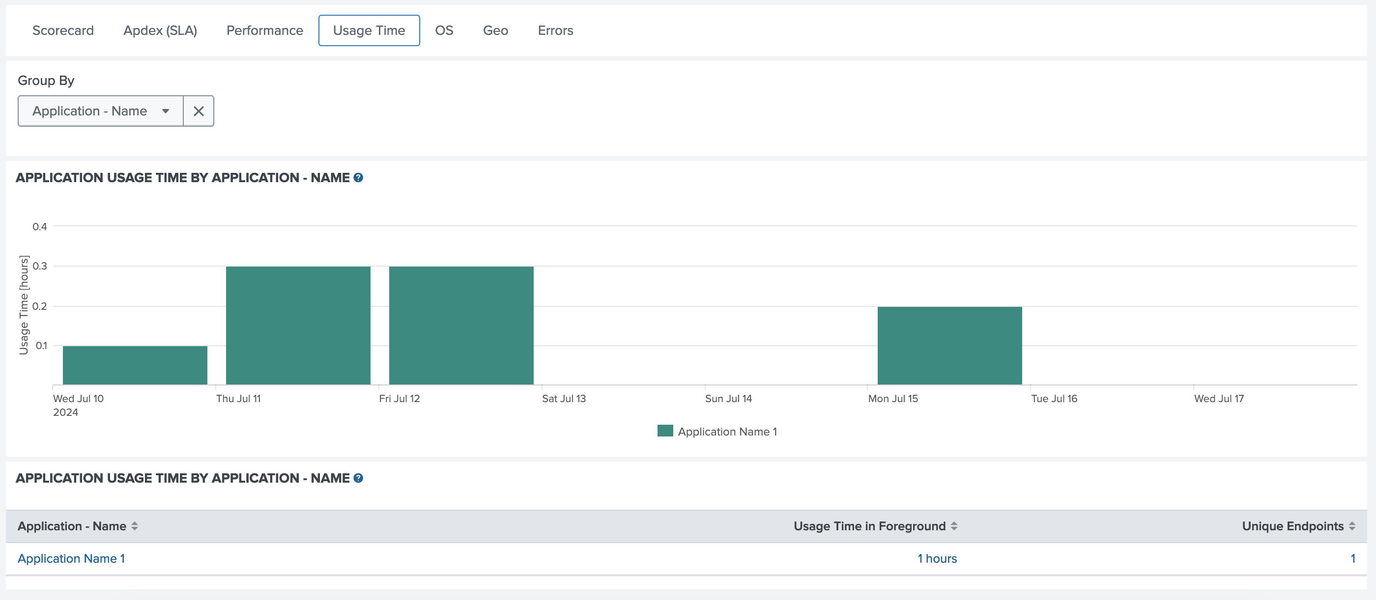 - Usage Time in Foreground: Total amount of time application spent in foreground while running. Values is total hours.