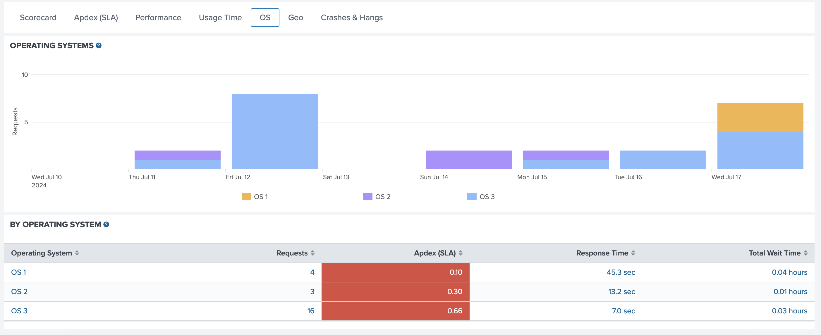 Access information related to the operating systems running the monitored web and desktop applications. When analysing data in this tab, click the table's row to display more details.