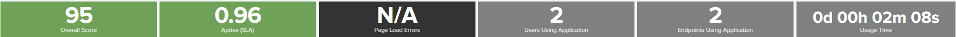 Web and desktop application's performance overview. Displays the overall scores for Apdex (SLA) and, depending on the application type, metrics for Page Load 4xx and 5xx Errors, or Crashes and Hangs for web and desktop applications, respectively.