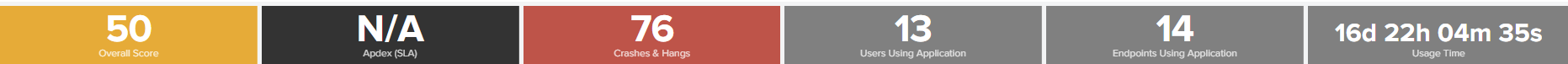 - Application Crashes: Displayed when analysing a desktop application. The application suffers a sudden exit during the program execution, usually related to an unhandled exception. Value is the total amount of crashes.