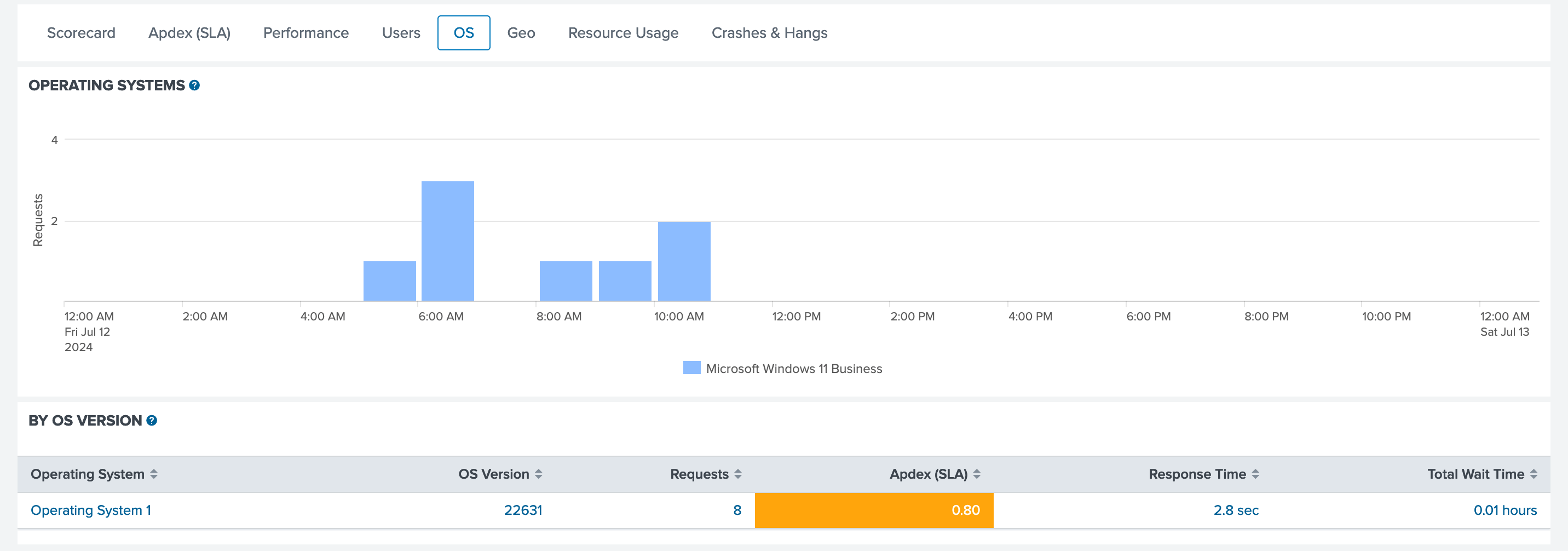 Access information related to the operating systems running the monitored desktop applications. When analysing data in this tab, click the table's row to display more details.