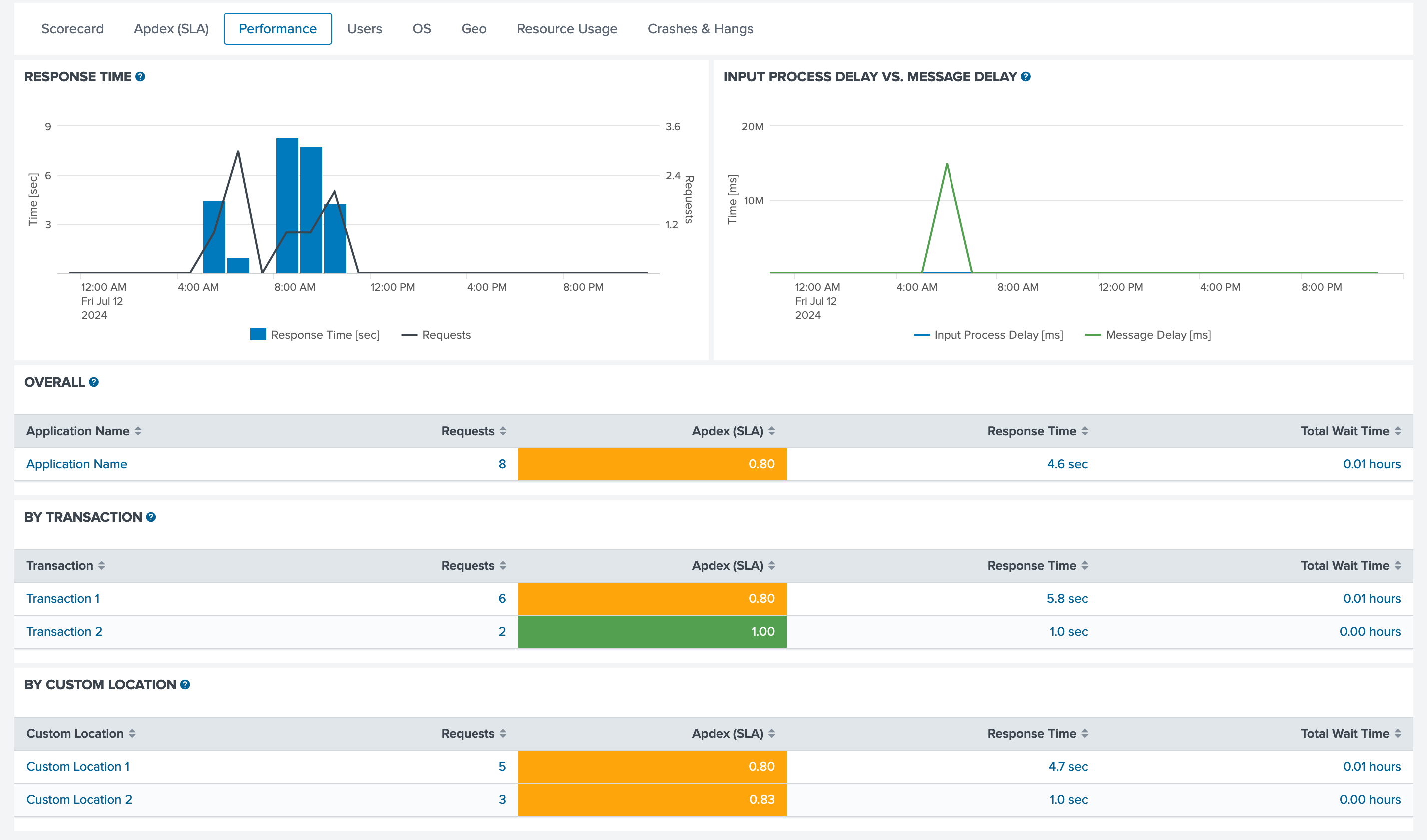 Desktop application's performance analysis with the overall data, transactions and custom locations. While navigating in this tab, click any table's row to access more details.