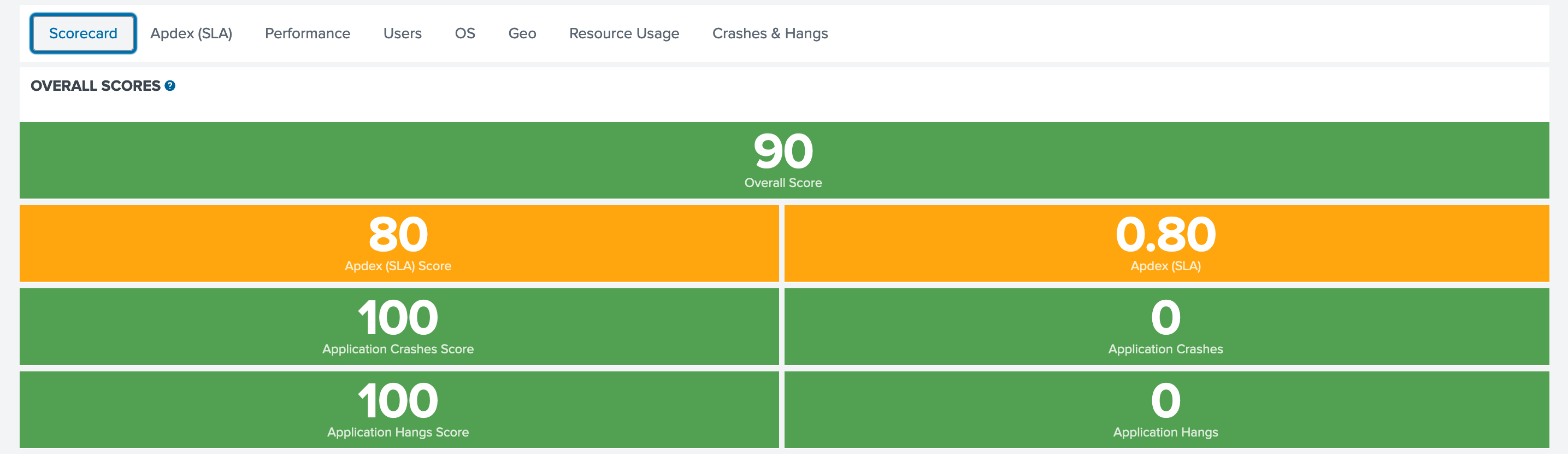 Desktop application's performance overview. Displays the overall scores for Apdex (SLA), Crashes, and Hangs metrics.
