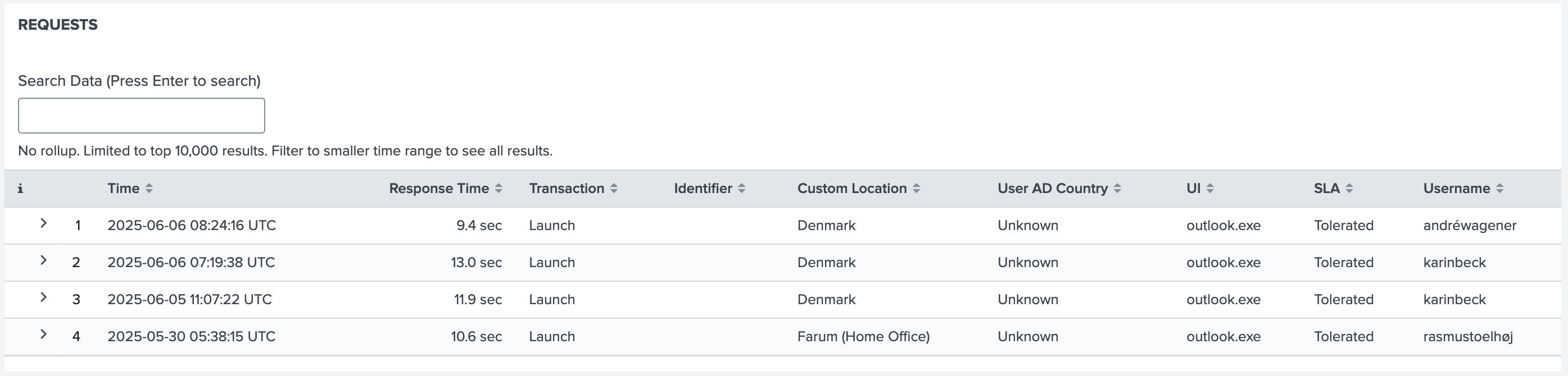 <YYYY-MM-DDThh:mm:ss>format. - Response Time: How long it took for the transaction to respond, in seconds.