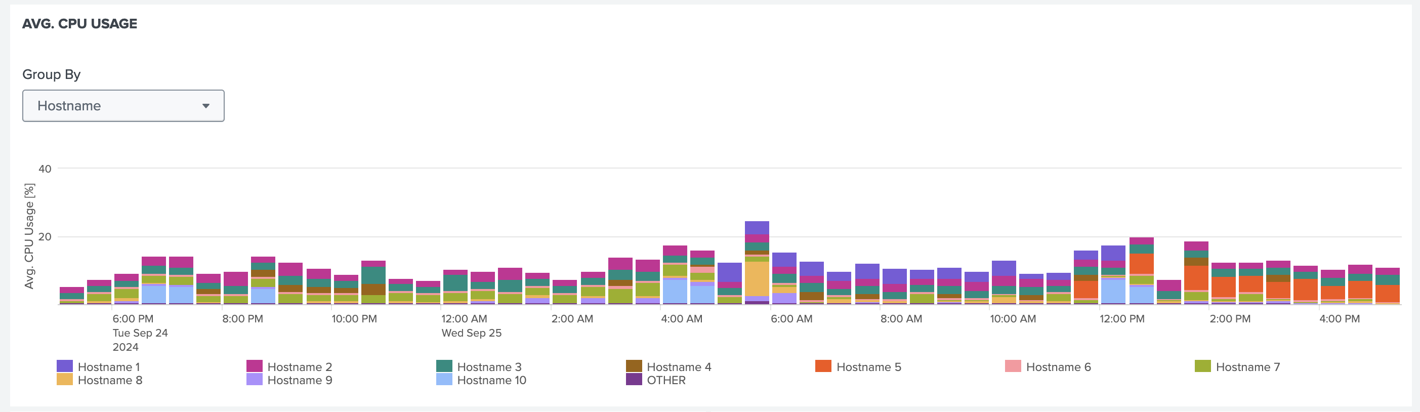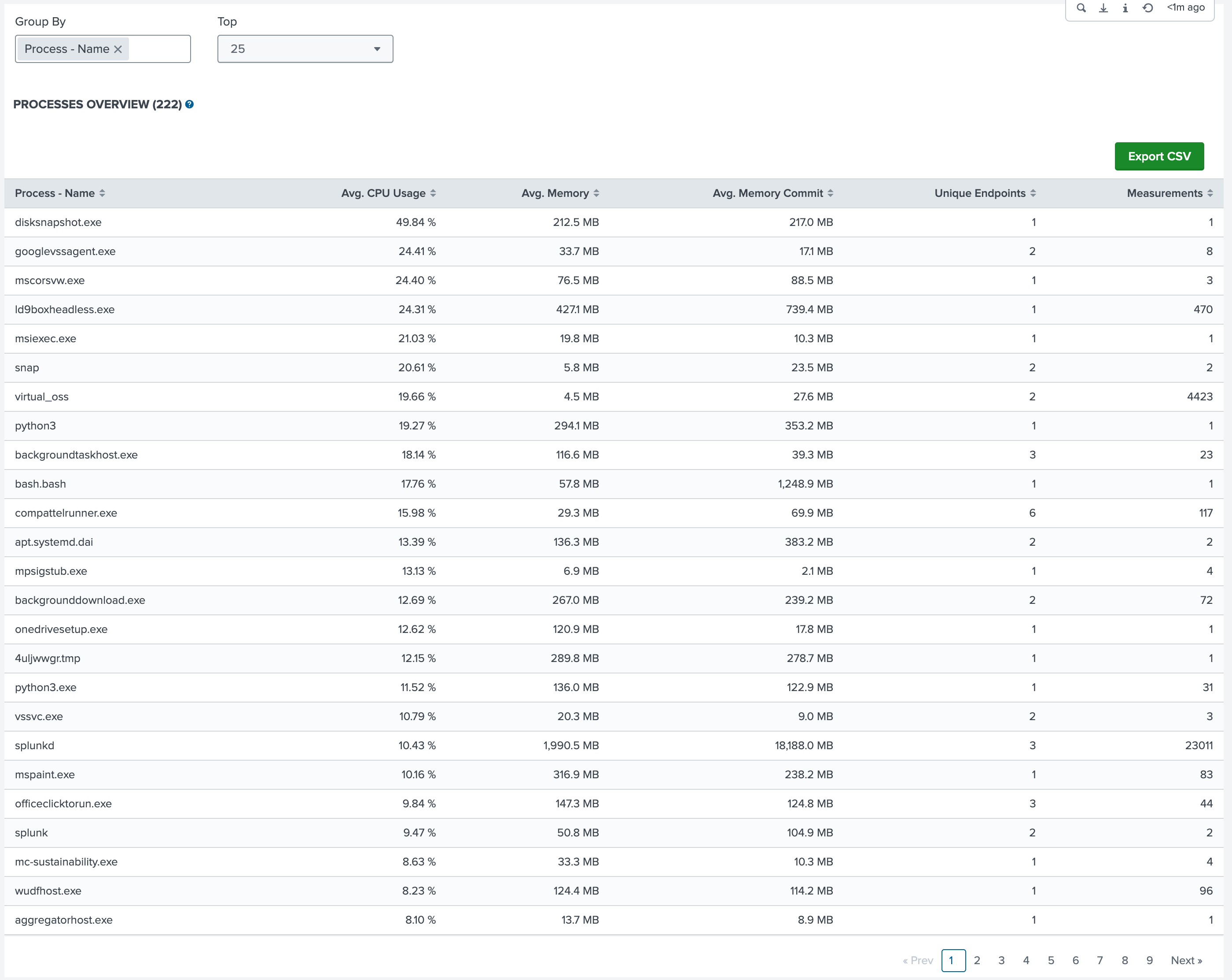 Chart displaying the average CPU usage grouped by Hostname, Username, Process, Session ID, or Cmd Line for improved analysis.