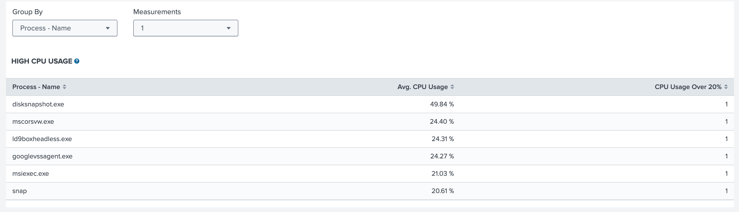 - CPU Usage Over 20%: Total count of times a process used over 20% of the CPU.