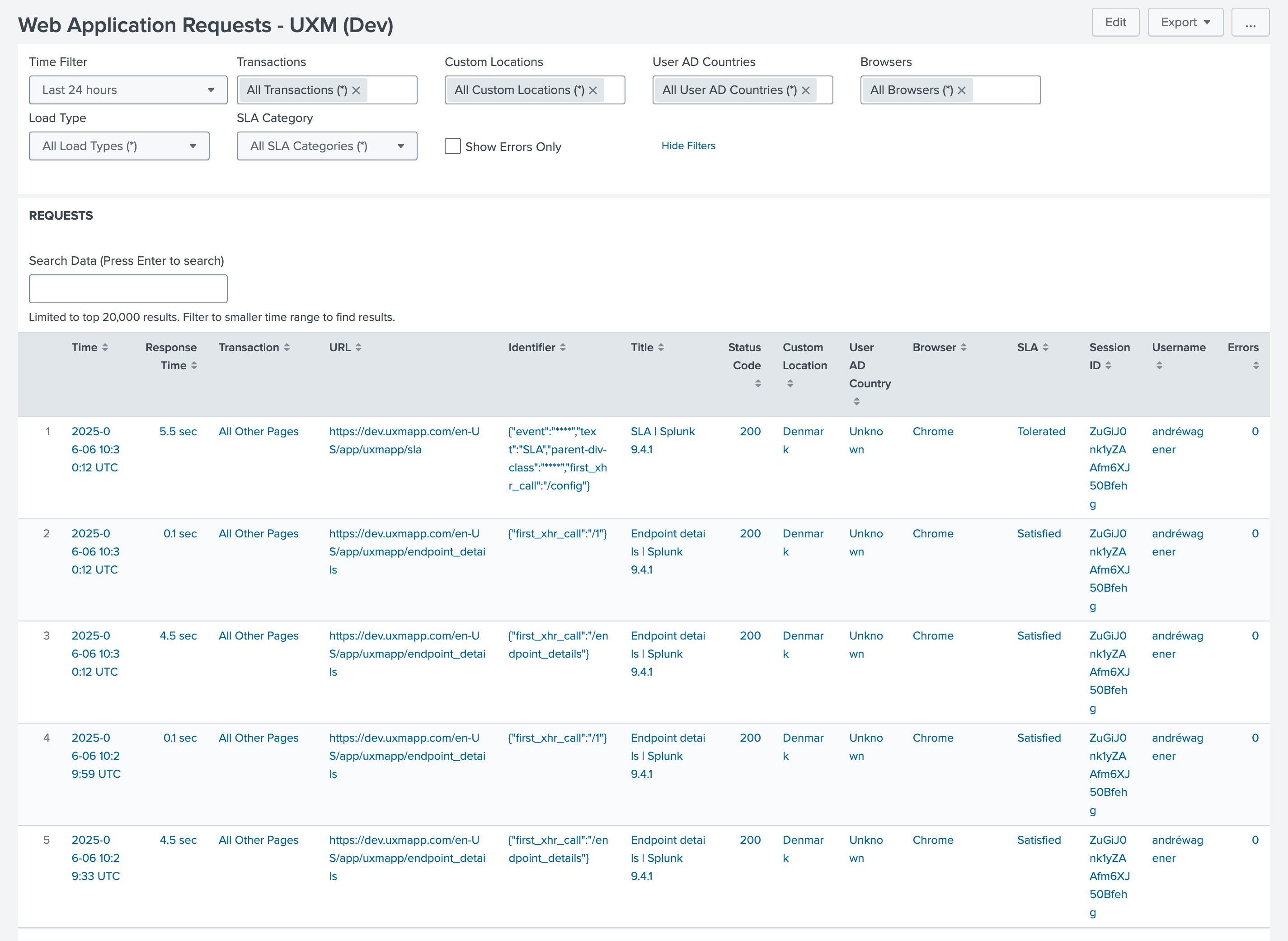 It further breaks down the request with status code, custom location, user AD country, browser, SLA (Service Level Agreement) status, session ID, username and Error. This comprehensive view enables users to track request performance, identify errors, and understand user behavior based on location and browser.