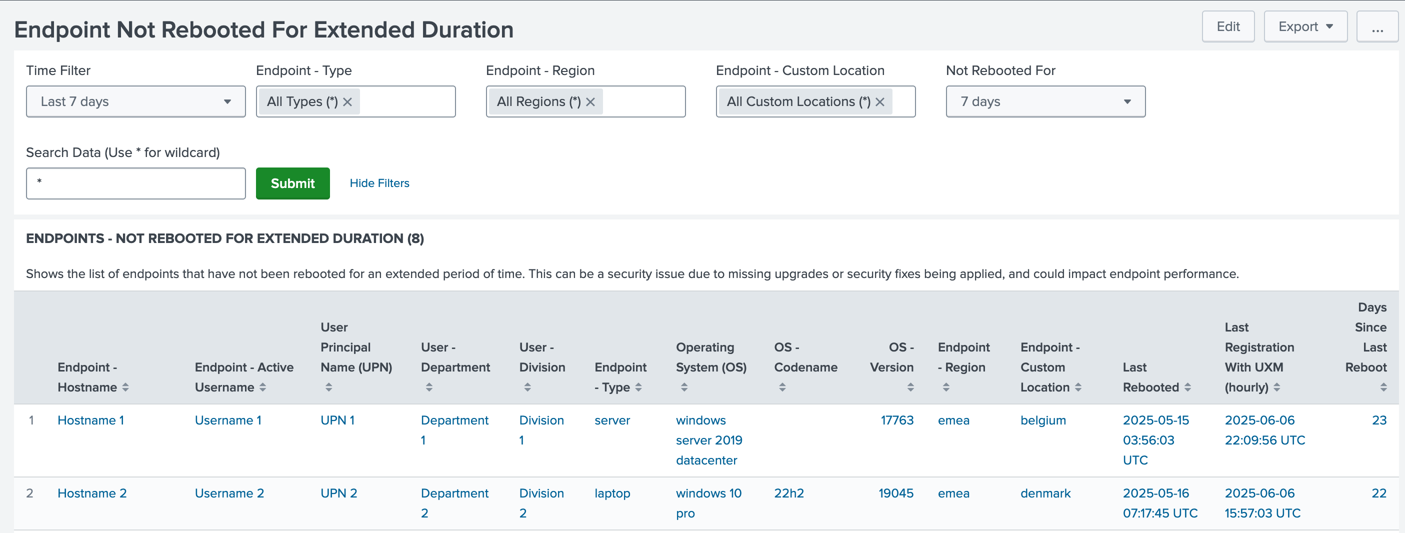 Displays a list of endpoints that have not been rebooted within a specified time frame.