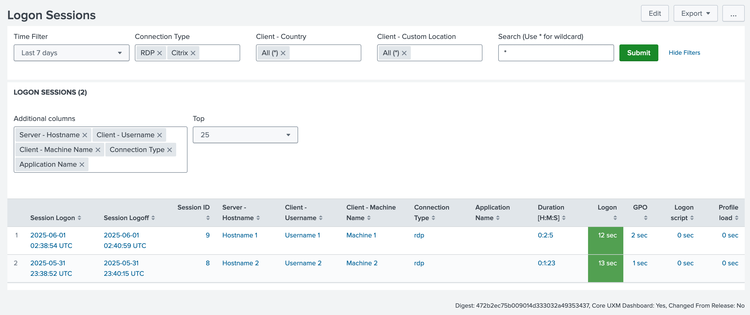 - A Logon Monitor needs to be configured in UXM under Administration -> UXM Desktop Agent -> Desktop monitors if logon/logoff sessions should be captured and calculated.