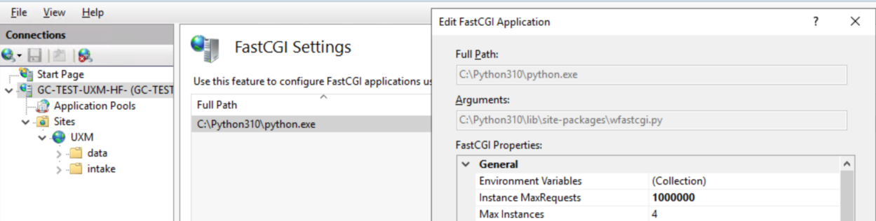 Open IIS Manager -> Server -> FastCGI Settings and edit the python item.