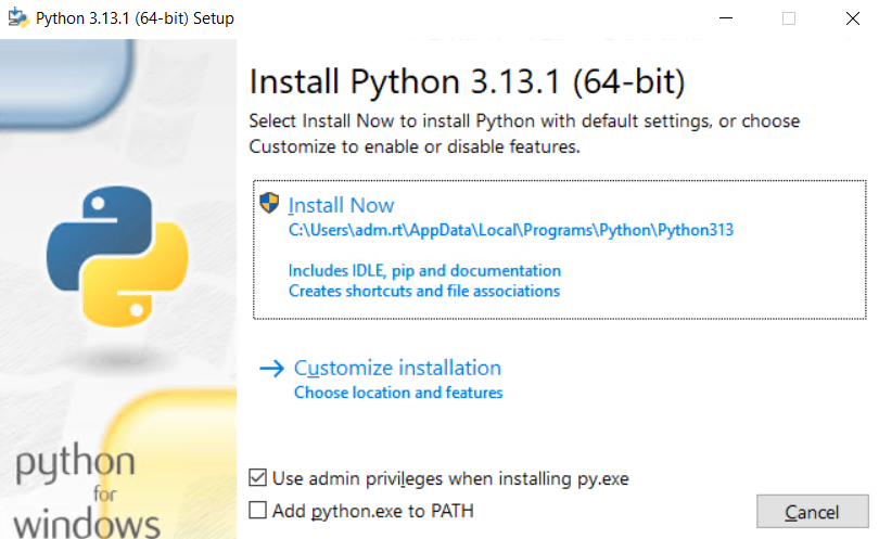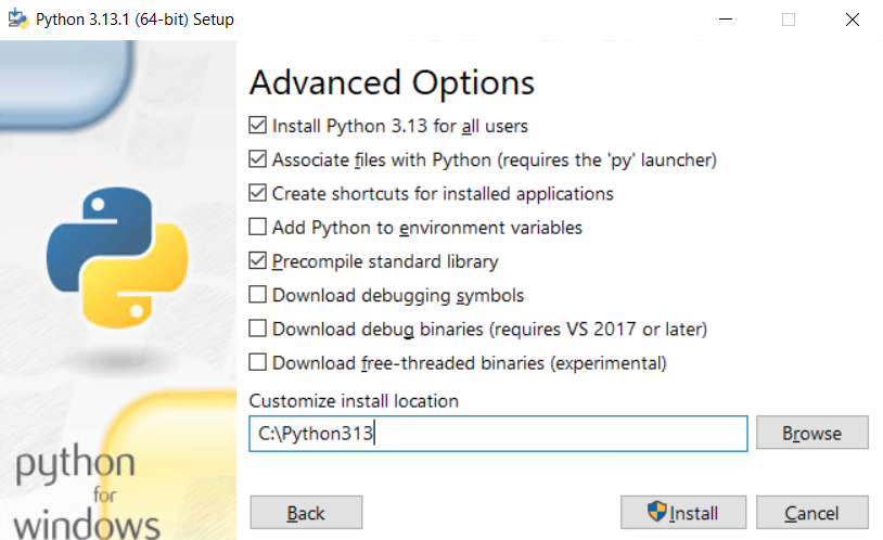 Under Advanced Options select "Install for all users" and install under "C:\Python313". (Avoid long paths or whitespaces in the path)
