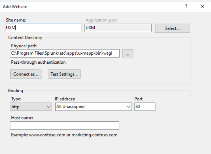 - Physical path: C:\Program Files\Splunk\etc\apps\uxmapp\bin\wsgi