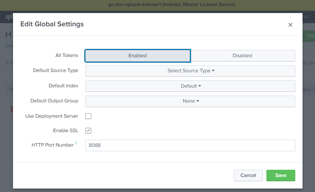 Write down the FQDN/IP of the Indexer, if SSL is enabled and Port number (Default 8088), these settings will be used later when setting up the Heavy Forwarder.