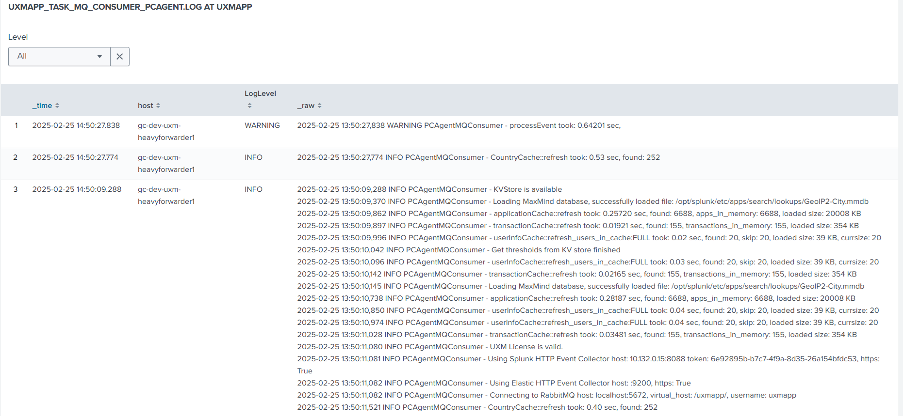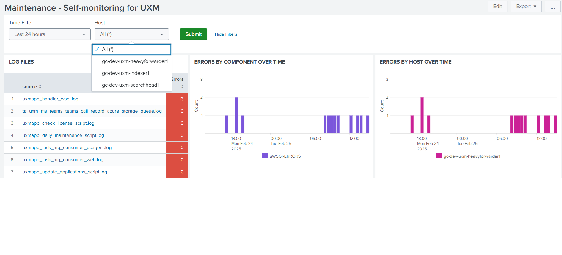 Open the UXM app on the Search Head and select Reports -> Maintenance Reports -> Maintenance - Self-monitoring for UXM, the dashboard show status on installation and report any errors detected.