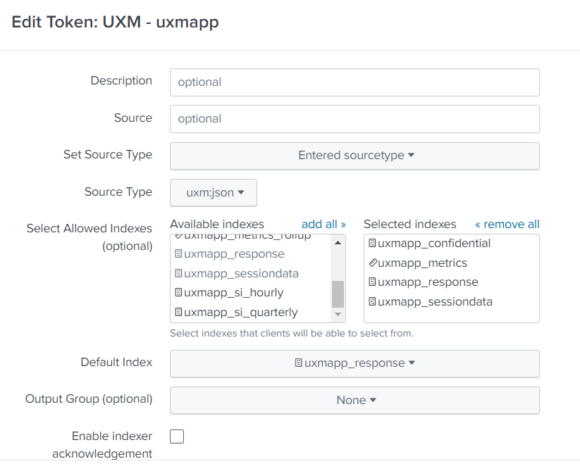 Create new HTTP Event Collector and call it "UXM - uxmapp", indexer acknowlegement has to be disabled.