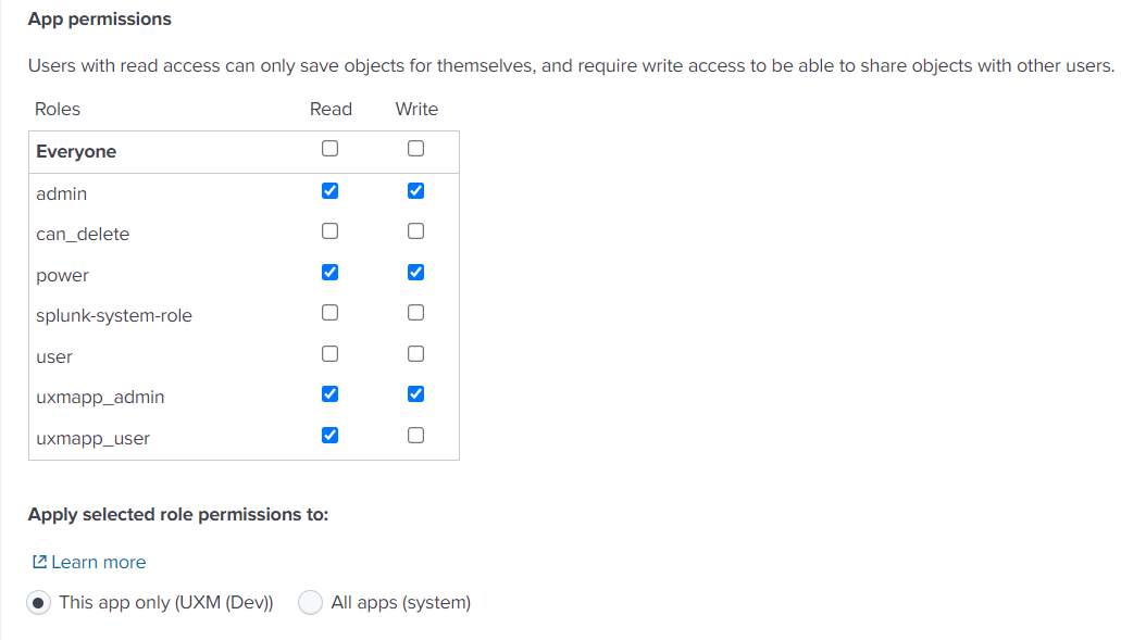 Add read permissions for the newly created uxmapp_user and read+write permissions for the uxmapp_admin user.