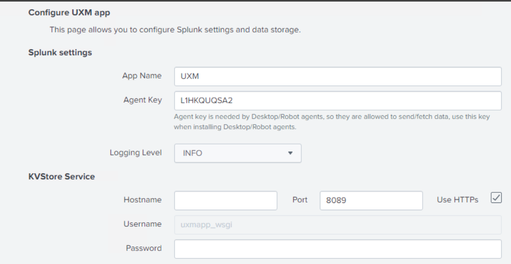 Open the UXM app, it will ask you to configure it, use same Agent Key as the Search Head, enter KVStore, HTTP Event Collector and RabbitMQ settings, leave rest of values as default and press save.