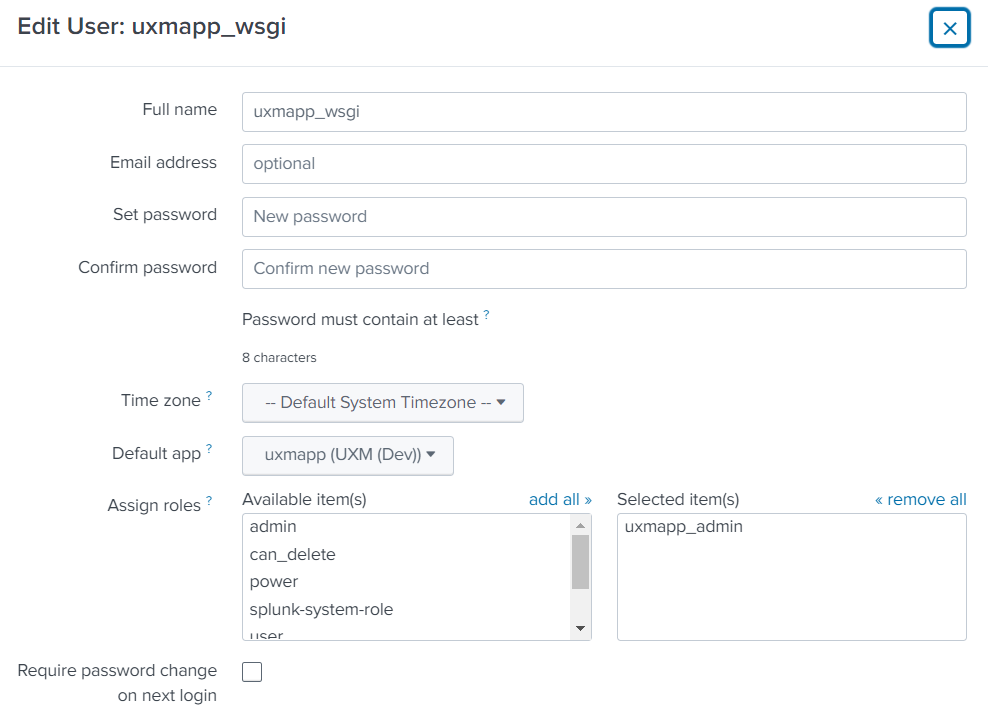 And a user called uxmapp_wsgi, reset the password for the user and disable that password change is required on next login, store the password it will be used later when setting up the Heavy Forwarder.
